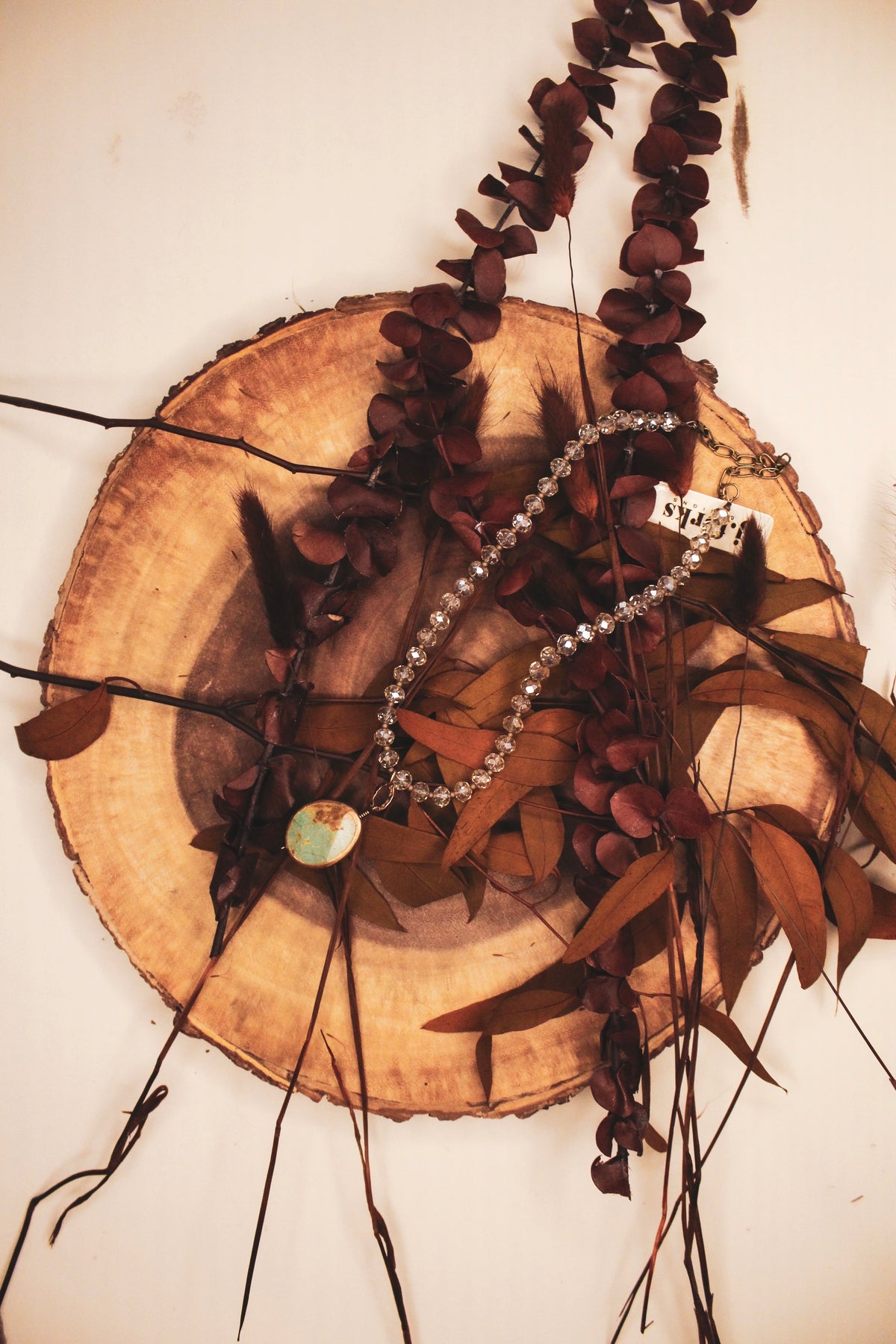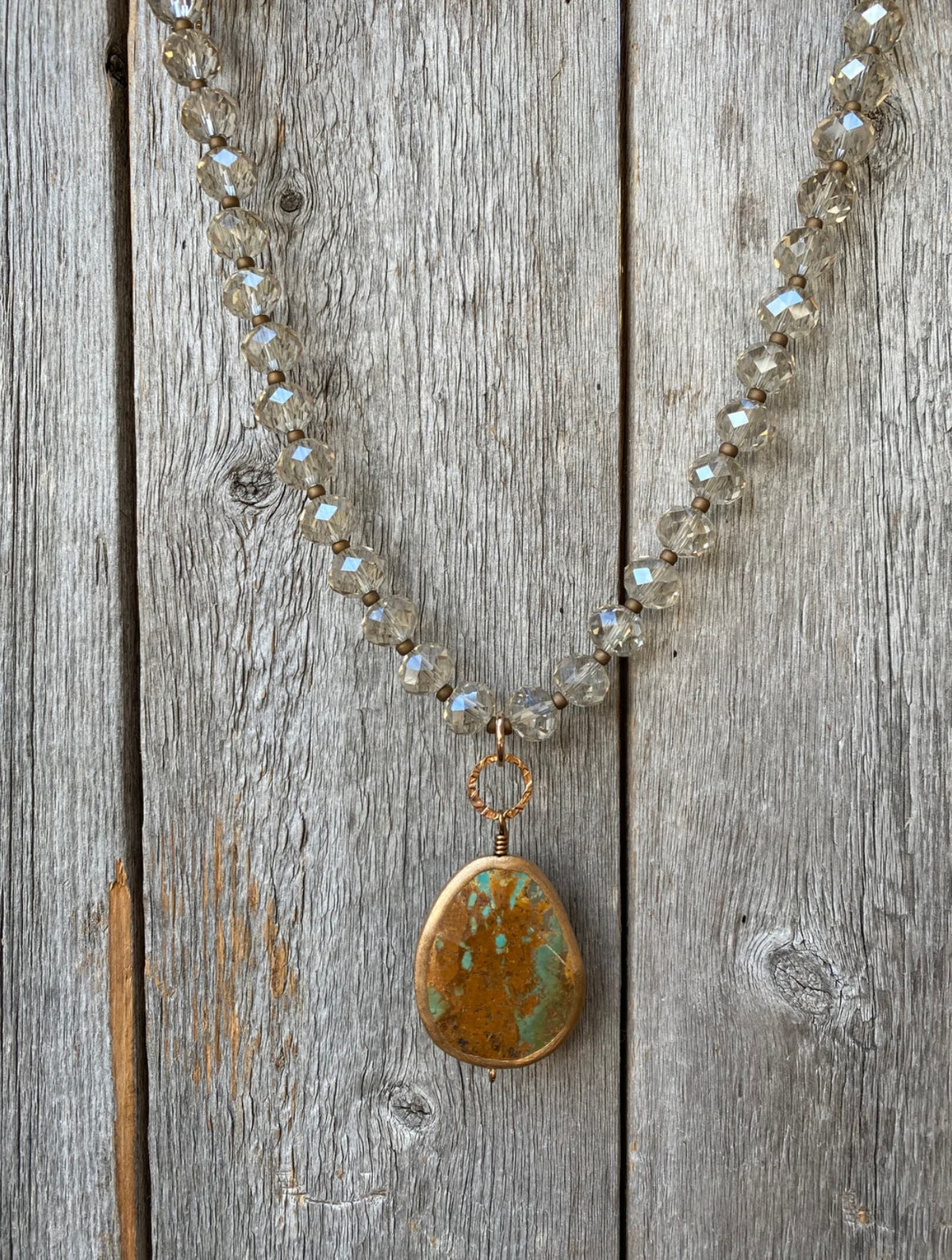 - 17” Golden austrian crystal with bronze edged kingman slab turquoise drop with solid bronze lobster claw and adjustable clasp.