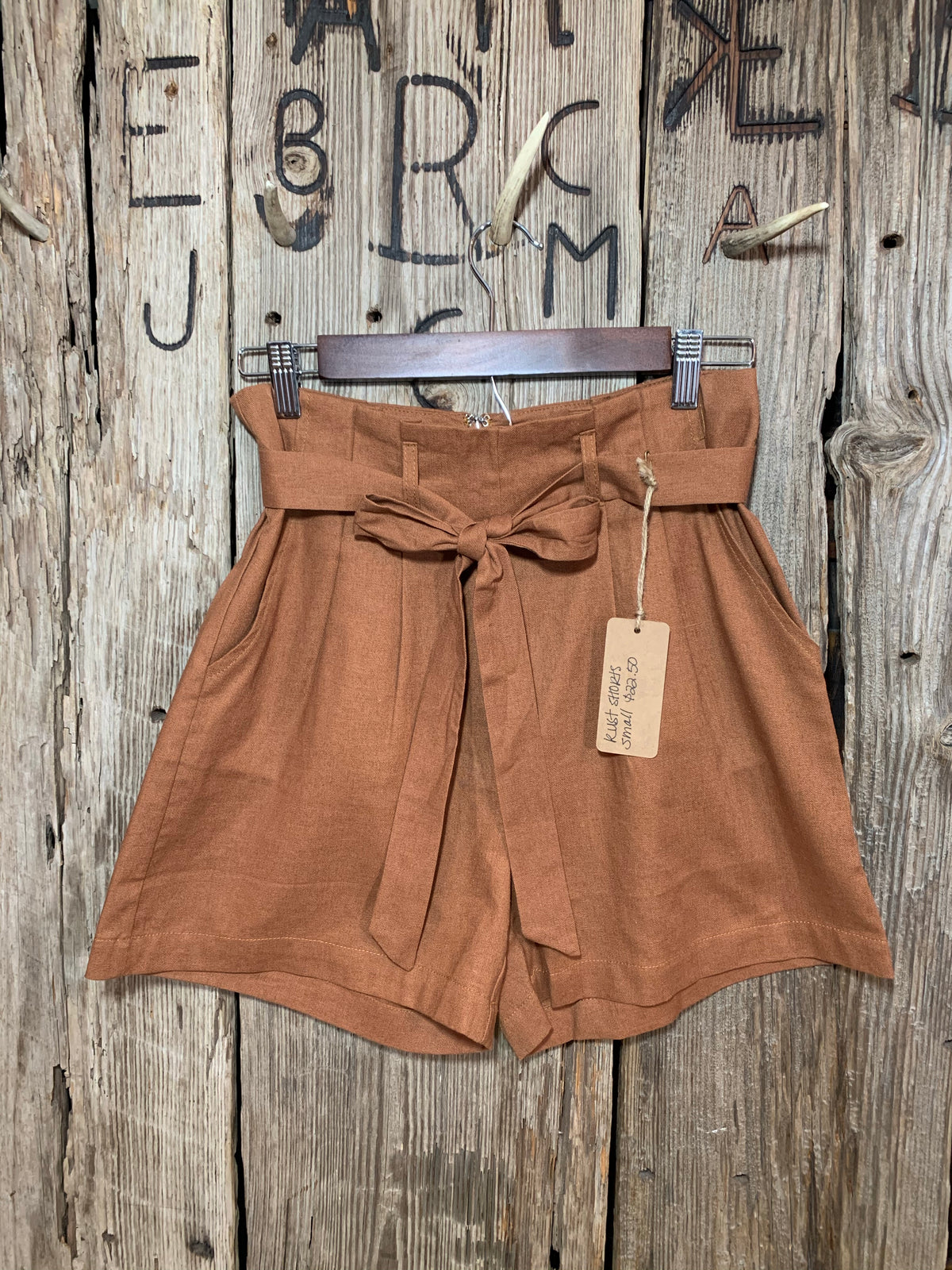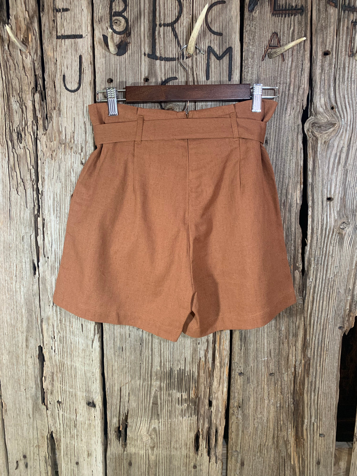 - Rust colored shorts.