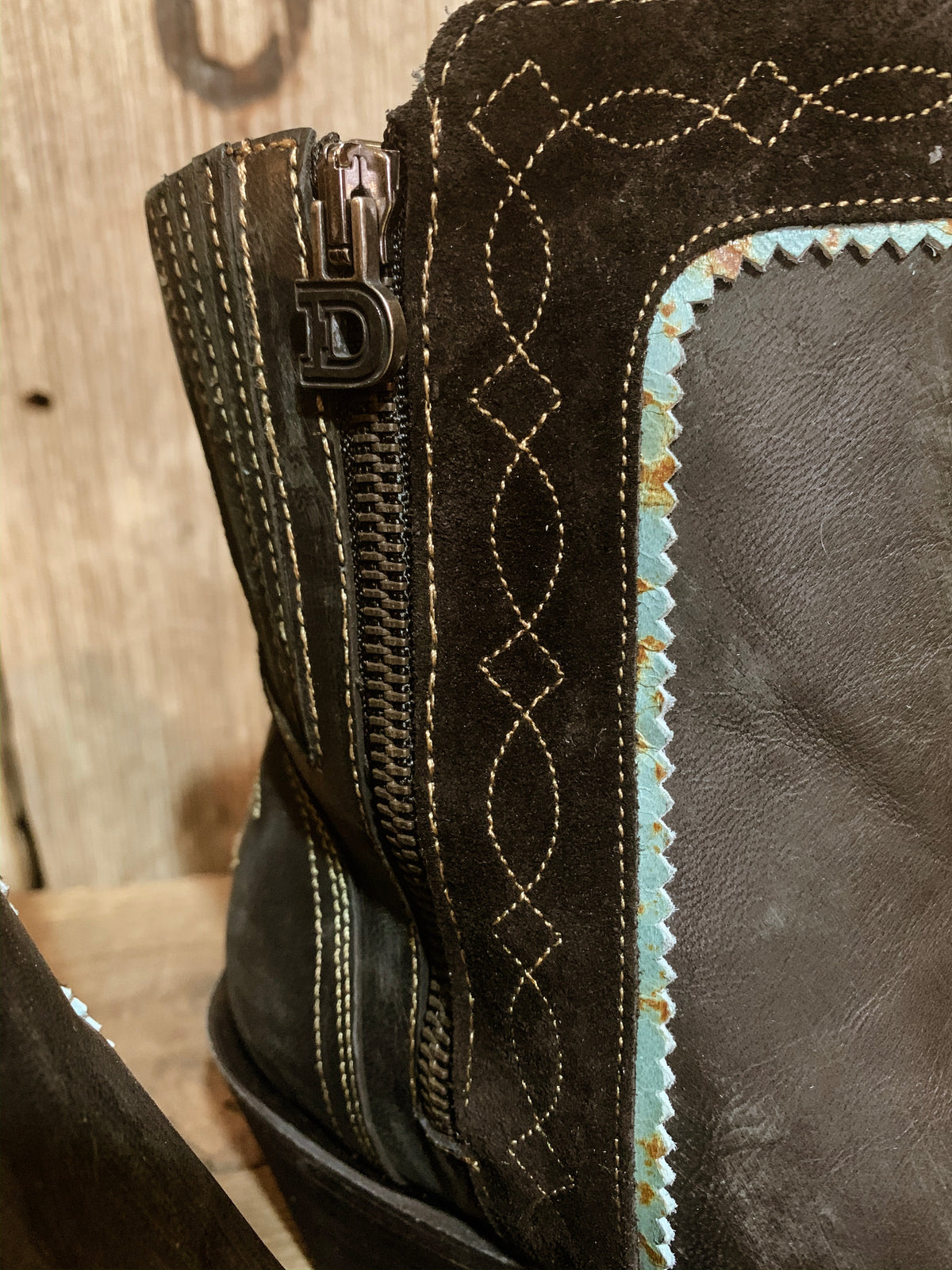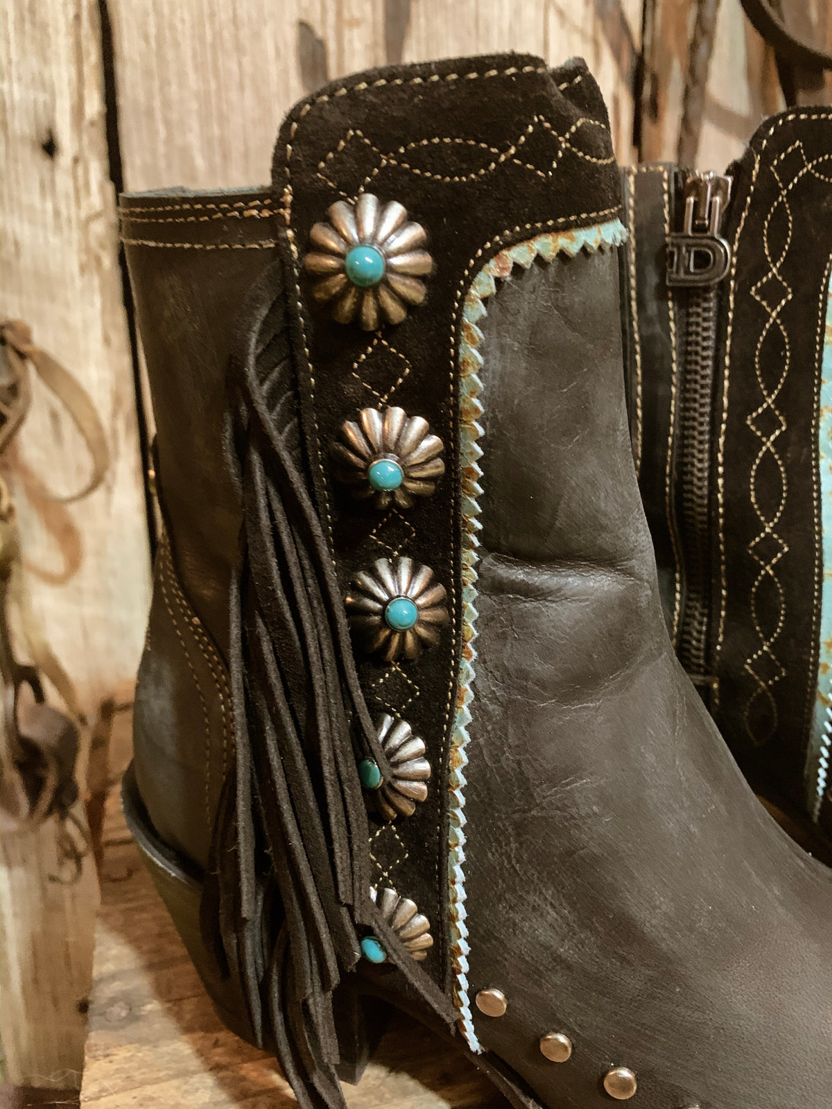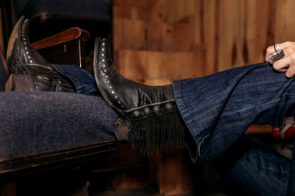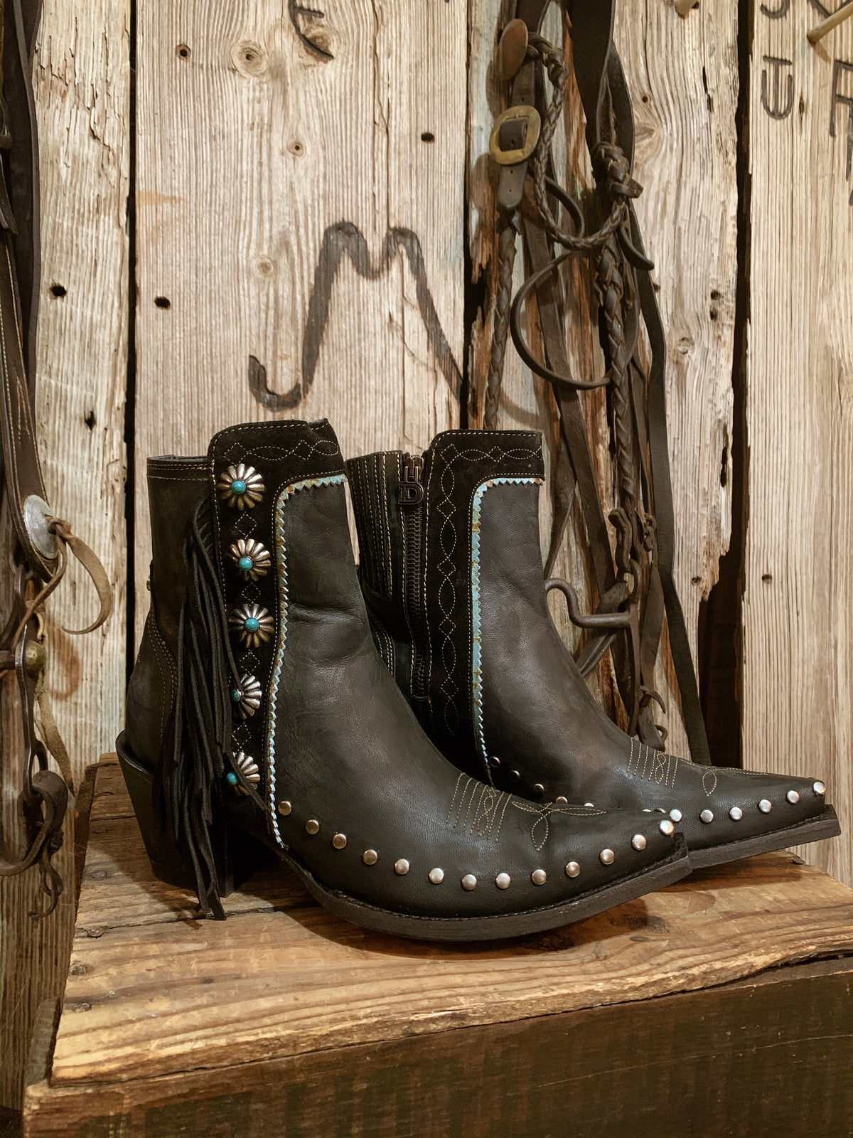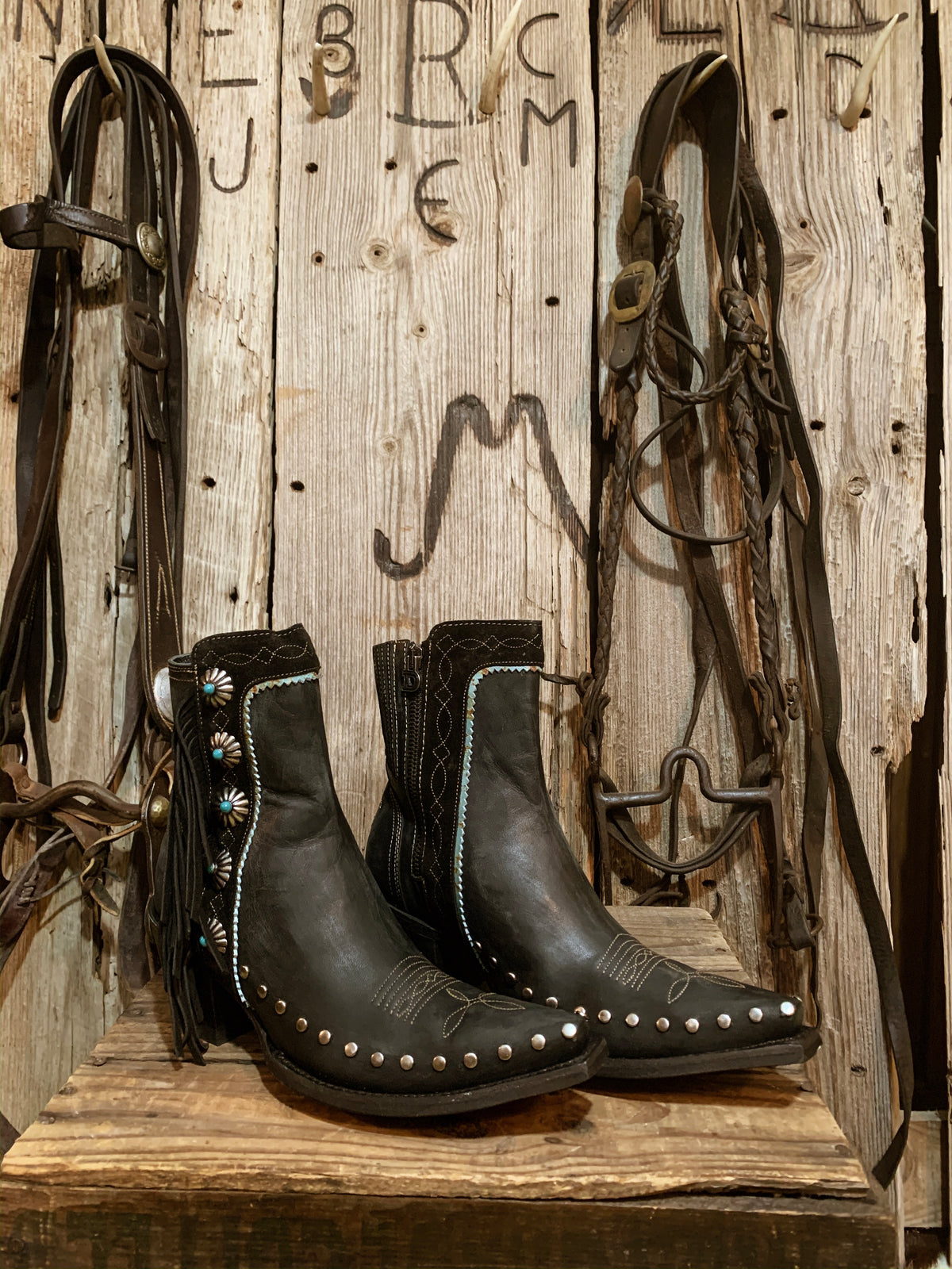 - Step up your boot game with this season popular mid-calf length. This boot adds a few more inches, a little more coverage, and a lot more style points. Hand crafted with contrast trim and sassy fringe, but it is the turquoise studded conchos that take this boot over the top.