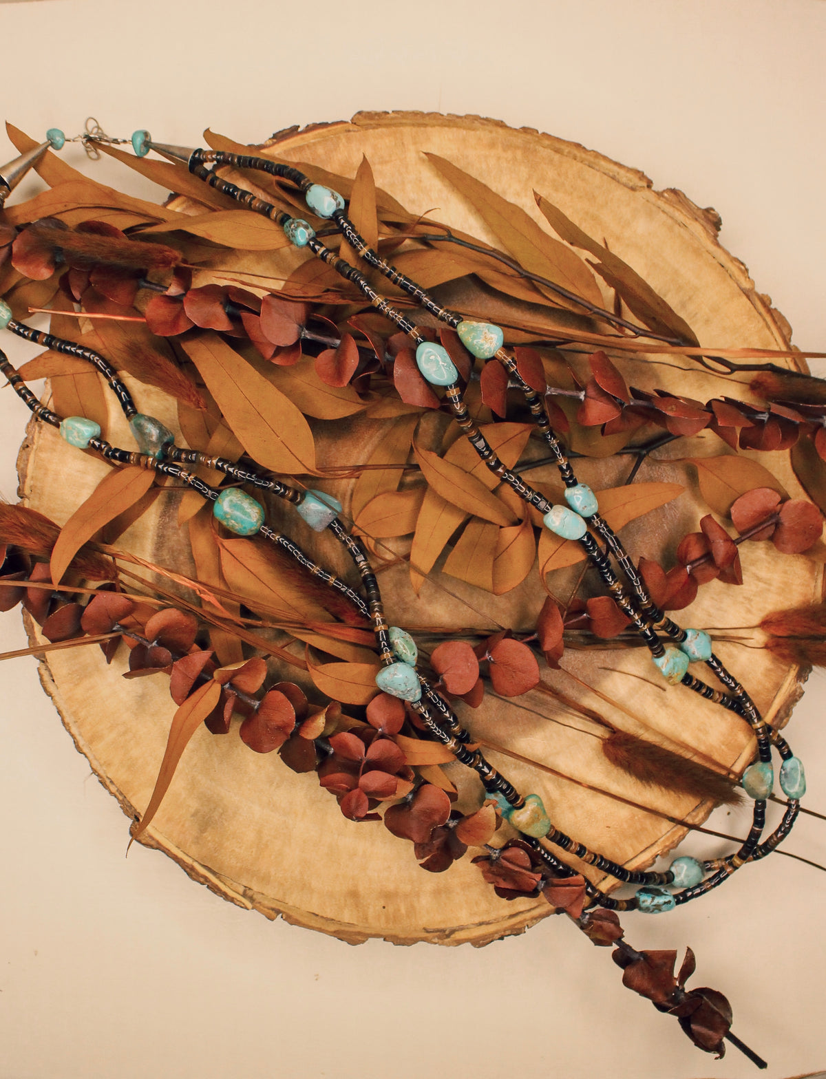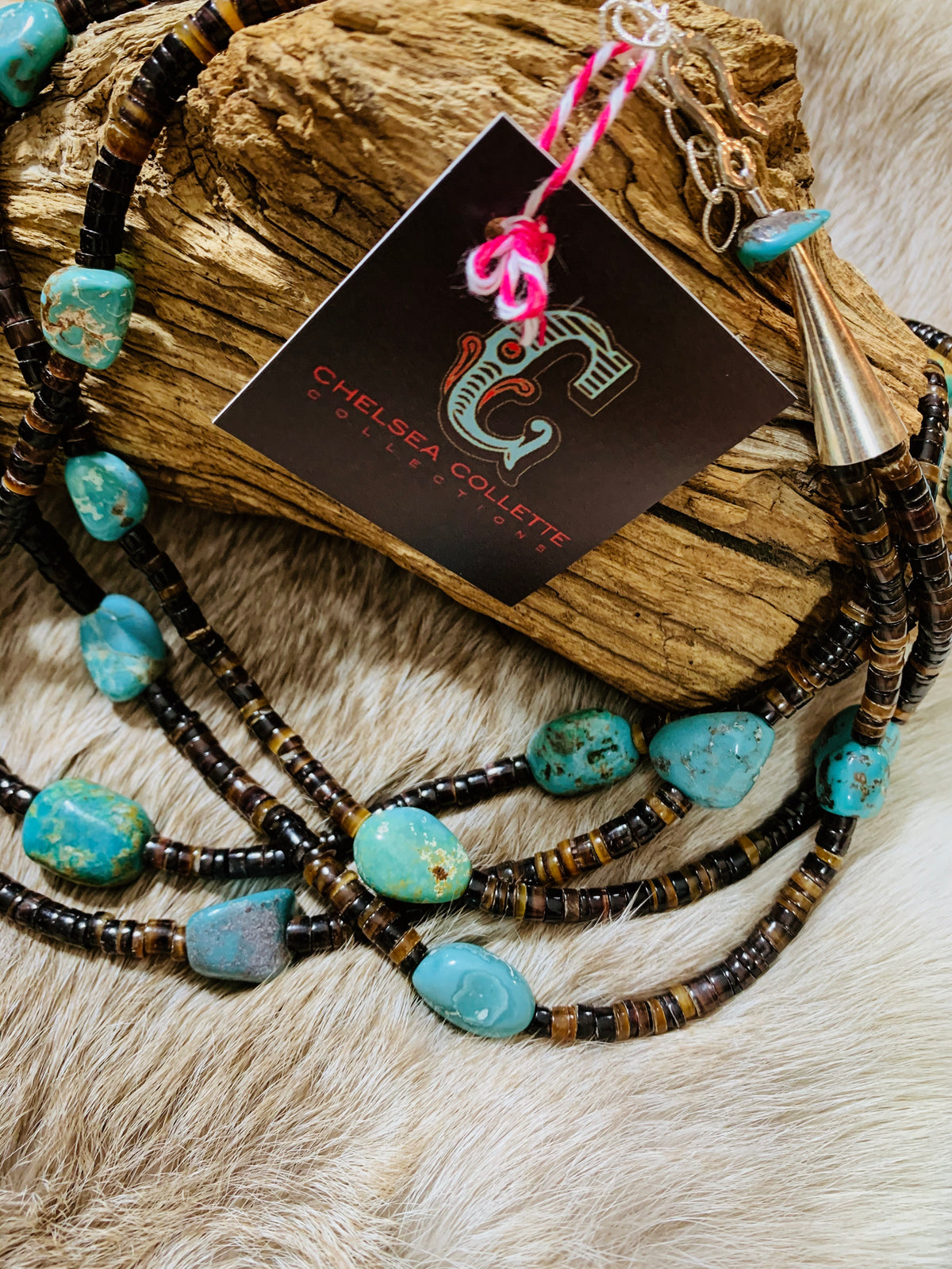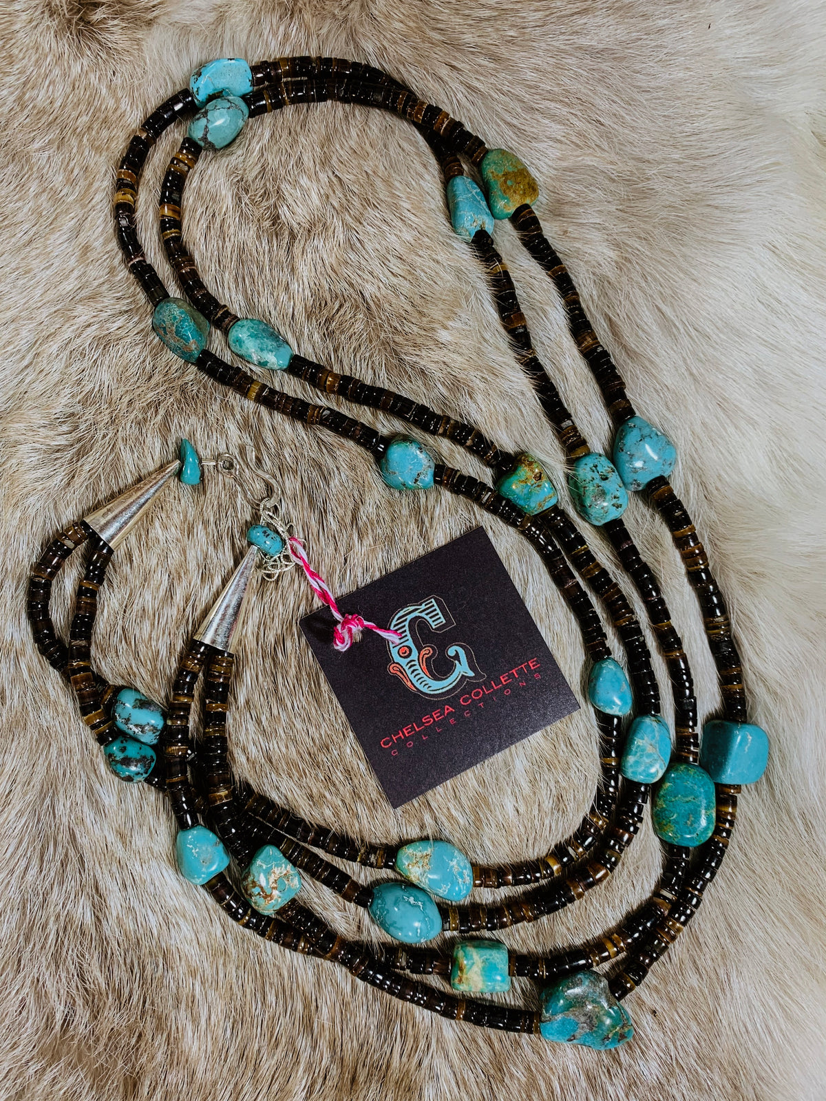 - Double stranded heishi beaded necklace with turquoise stones