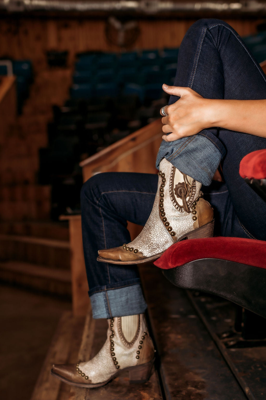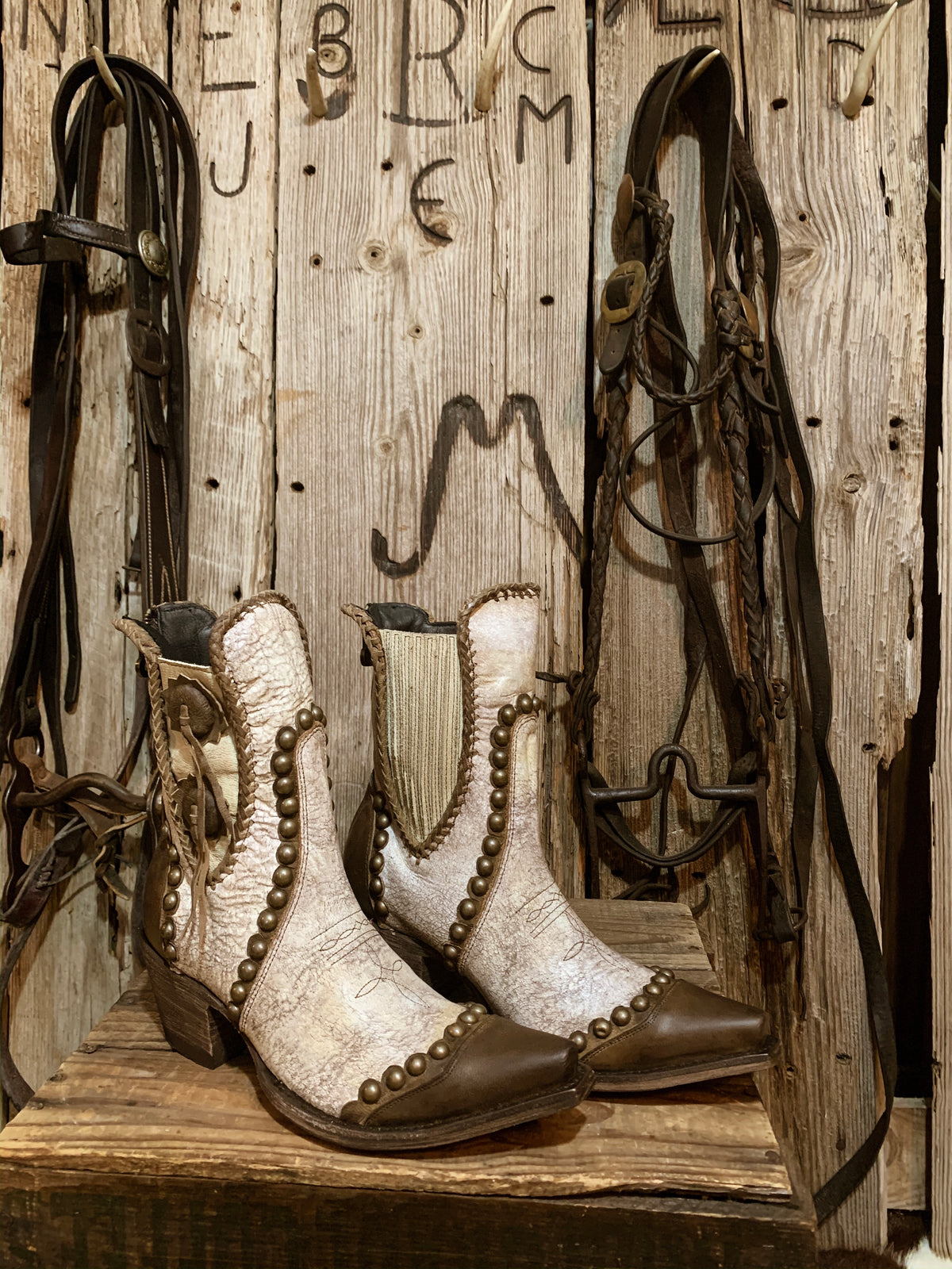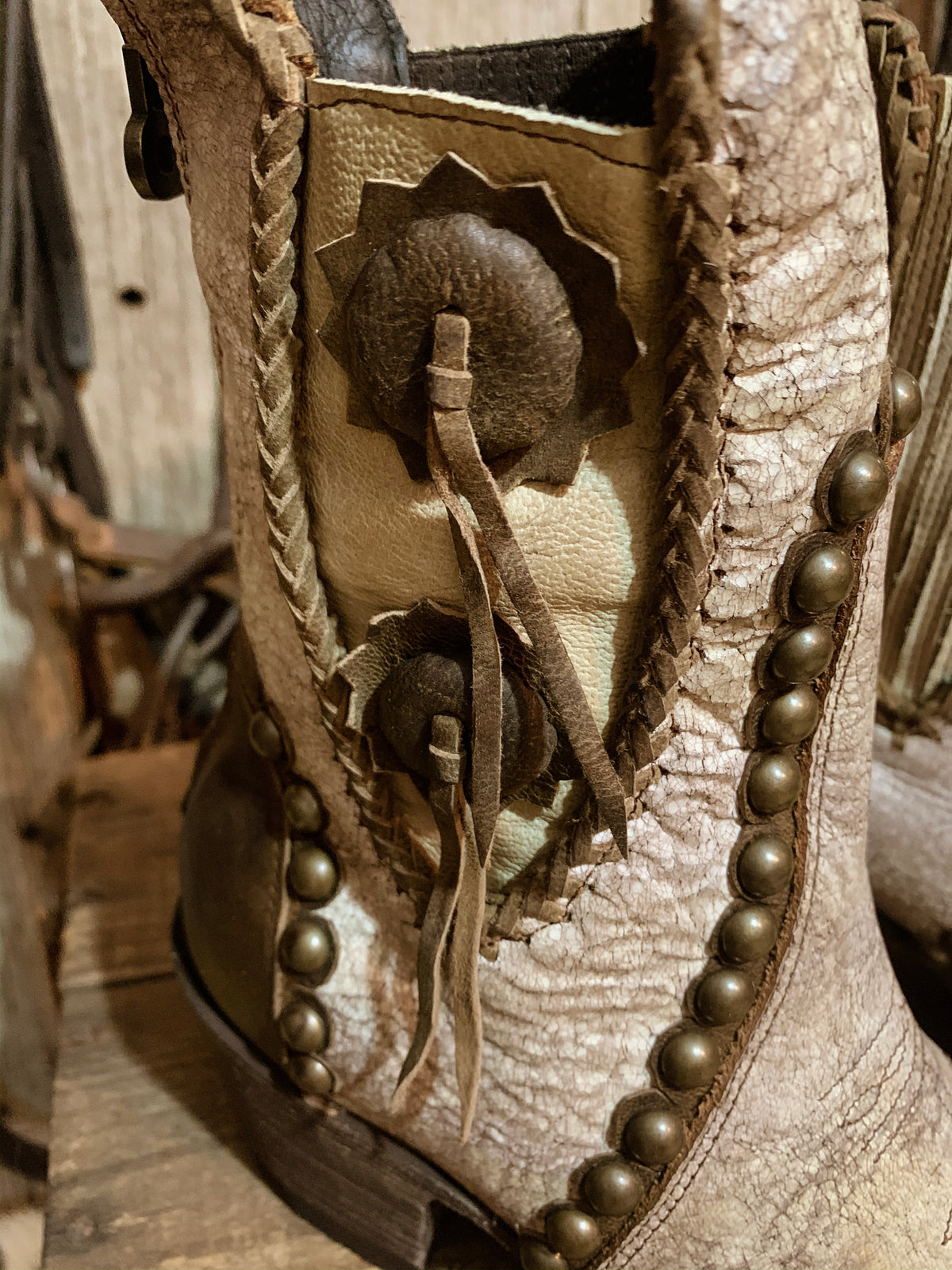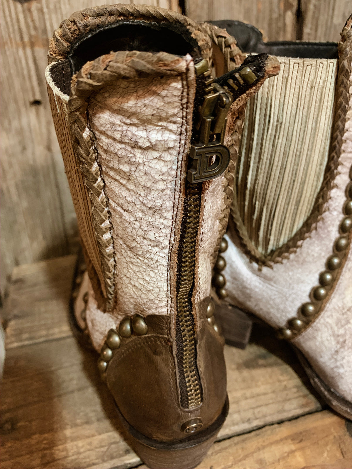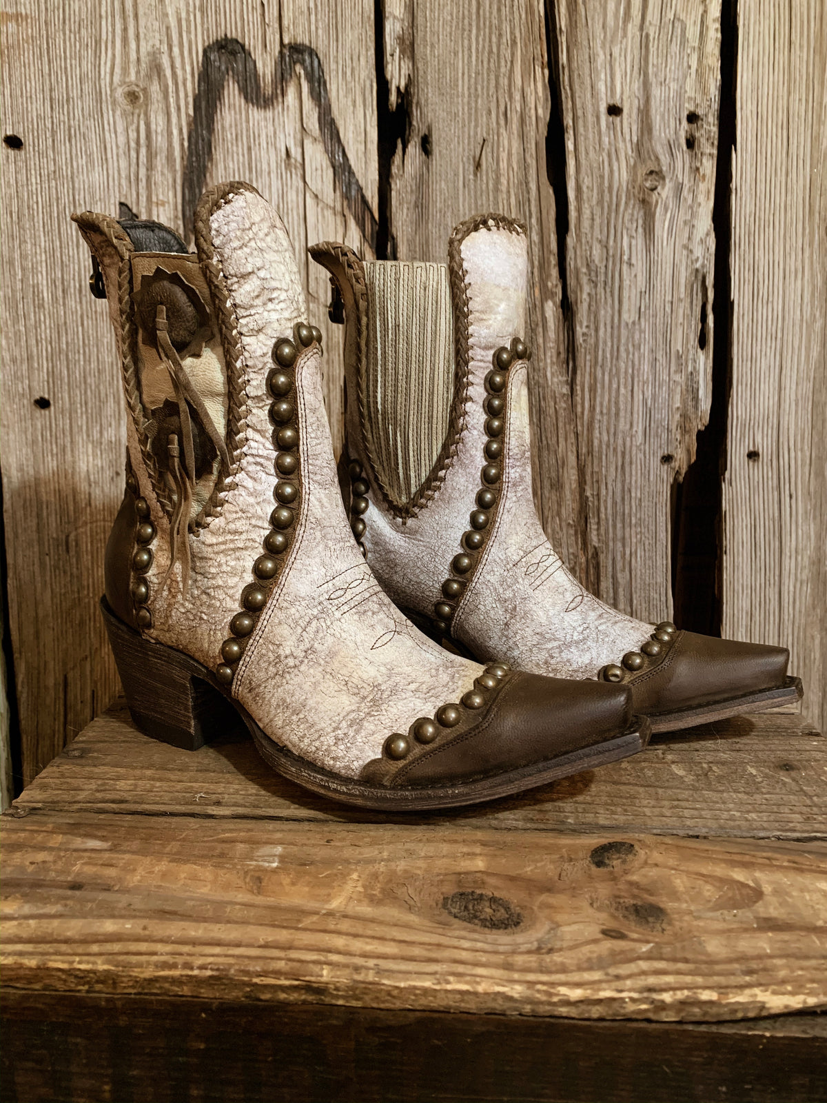 - A retro shortie with a sassy attitude. Concho and chunkier nail-head studs makes this a statement pair to own. Crackled white leather that gives a more vintage and worn look. Contrast chocolate trimming with overlay on the heel counter and toe.